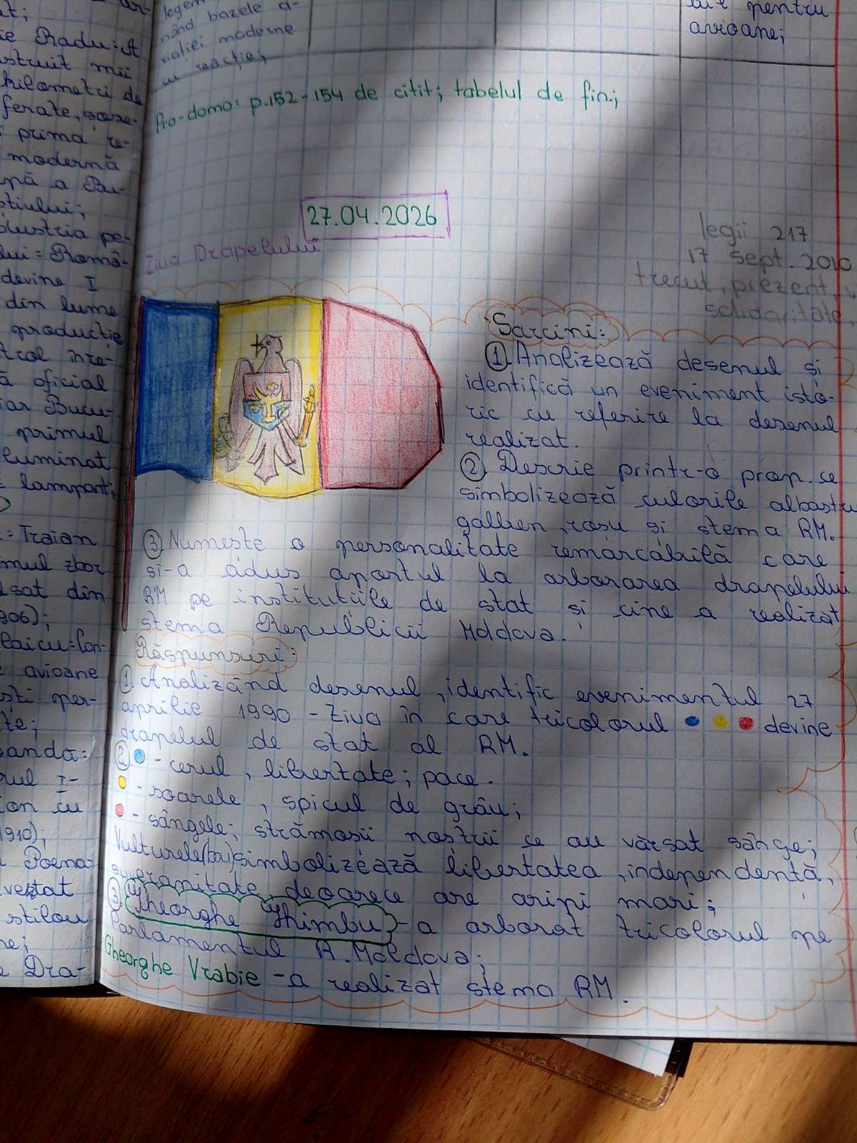 În IPLT „Onisifor Ghibu”, la data de 27 aprilie 2026, au fost organizate și desfășurate activități dedicate Zilei Drapelului de Stat al Republicii Moldova, în conformitate cu ordinul Direcției Generale Educație, Tineret și Sport nr. 01/1-7/516 din 24.04.2026.