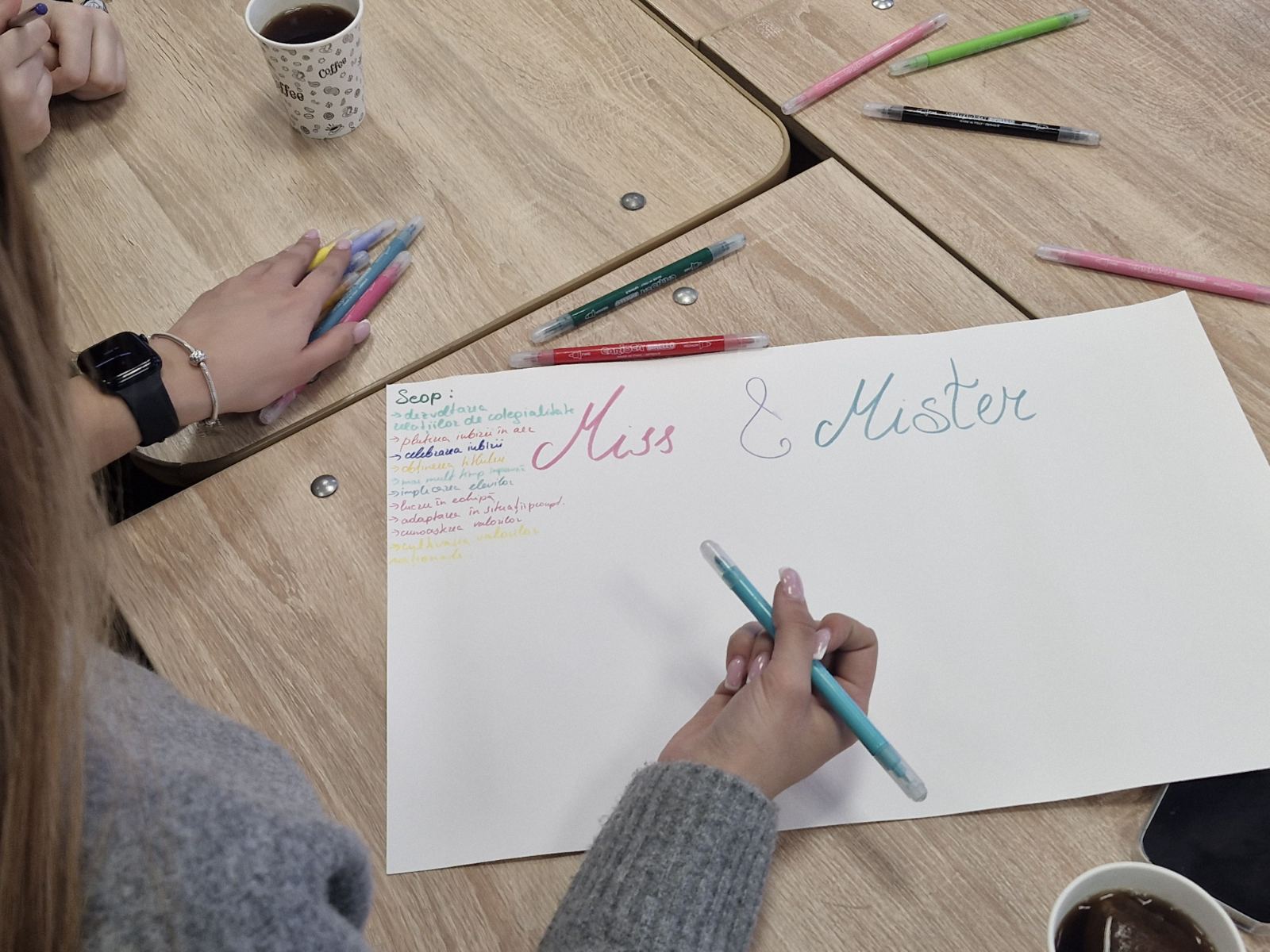Momentul culminant al atelierului a fost cel dedicat exercițiului practic. Înarmați cu foi colorate, markere și multă imaginație, elevii au lucrat individual sau în echipe pentru a schița mini-proiecte. Aceștia au dat viață unor titluri sugestive, stabilind obiective și rezultate palpabile.