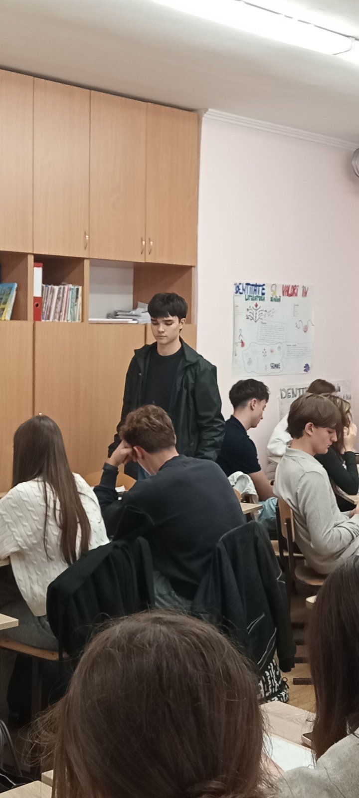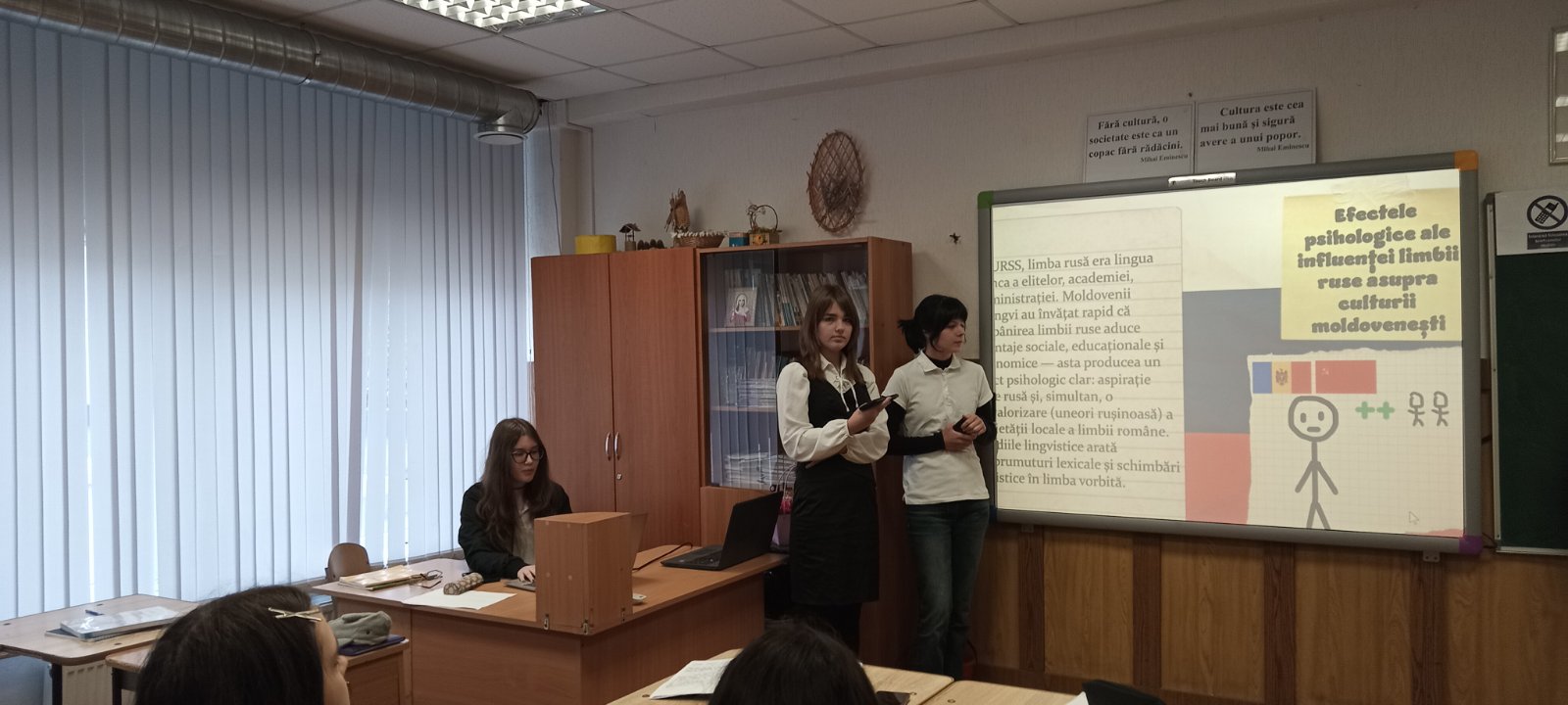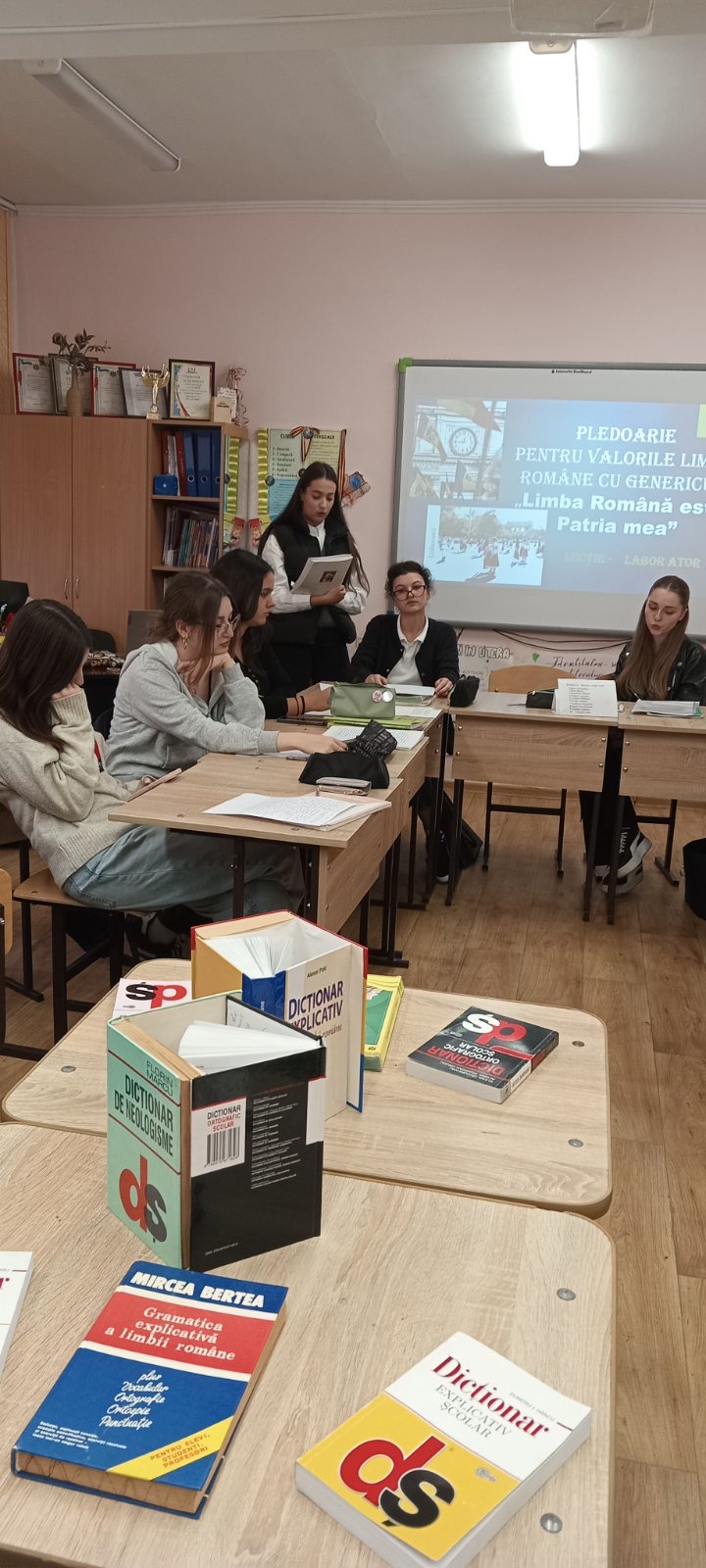 De aceea am discutat cu elevii claselor a X-a „A” și a XII-a „A”, împreună cu care convenim și construim procesul educativ la disciplina Limba și literatura română, și am preconizat activități care să finalizeze cu elaborarea unor produse creative, care să le descopere elevilor noi aspecte valorice ale limbii române – clasa a X-a, și ale limbii și literaturii române ca proces integrat, pentru elevii din clasa a XII-a „A”. Astfel, elevii din clasa a XII-a „A” au realizat niște studii a diverselor aspecte funcționale ale limbii române și și-au susținut observațiile, ideile și concluziile într-o conferință cu genericul „Pledoarie pentru Limba română, valoare spirituală de prim rang în sistemul de valori ale neamului”. Pledoariile au fost ascultate cu multă atenție pentru a fi evaluate și ierarhizate în formatul unui top al celor mai elocvente în susținerea unor idei personalizate, îndrăznețe și plauzibile. Elevii din clasa a X-a „A” au realizat prezentări și proiecte cu tematică diversă, care să demonstreze valorile limbii române în actualitate. Cele mai interesante proiecte au fost două cu tema comună: „Importanța Limbii Române în formarea și afirmarea personalității umane”, realizate prin aplicarea chestionarelor tematice și a interviului în cazul elevilor și doar a interviului în cazul profesorilor liceului nostru. Autorii proiectului au adunat un bogat material factologic, din care vom plasa ca dovadă doar o parte.
